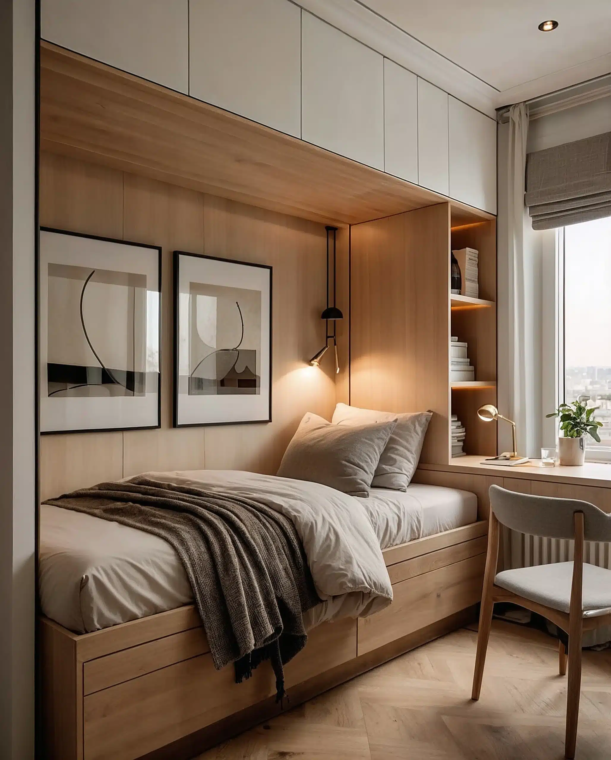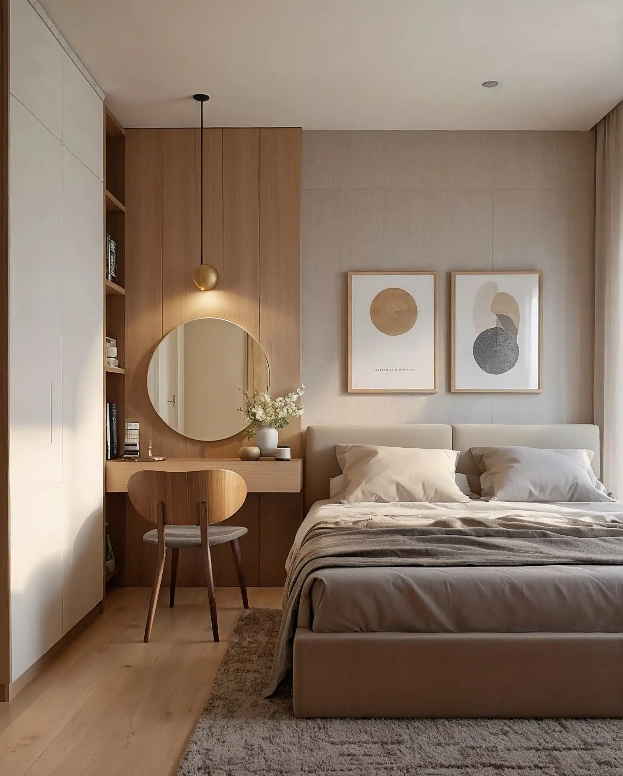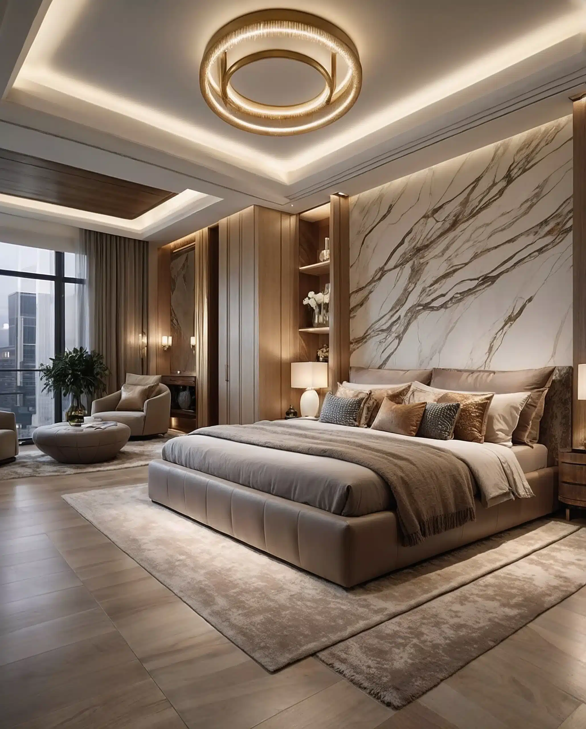 Generous ceiling heights enhance spatial flow, while earthtoned palettes, large-format stone-look tiles, warm laminates